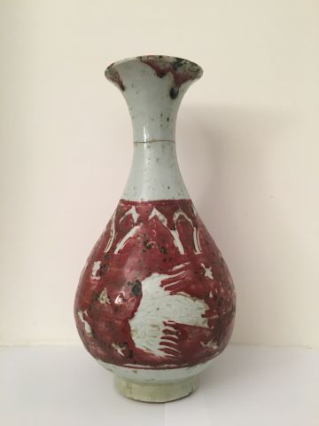 Vase piriforme en porcelaine et émail céladon, à décor en rouge de fer de phoénix et oiseaux. Chine, vers 1900. H. 27 cm (Col coupé)
