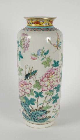 Vase rouleau en porcelaine à décor polychrome de fleurs et d'insectes, col à décor de chauve souris sur fond jaune, signé. Marque Guangxu sur la base. Chine, fin XIXe. H. 31 cm
