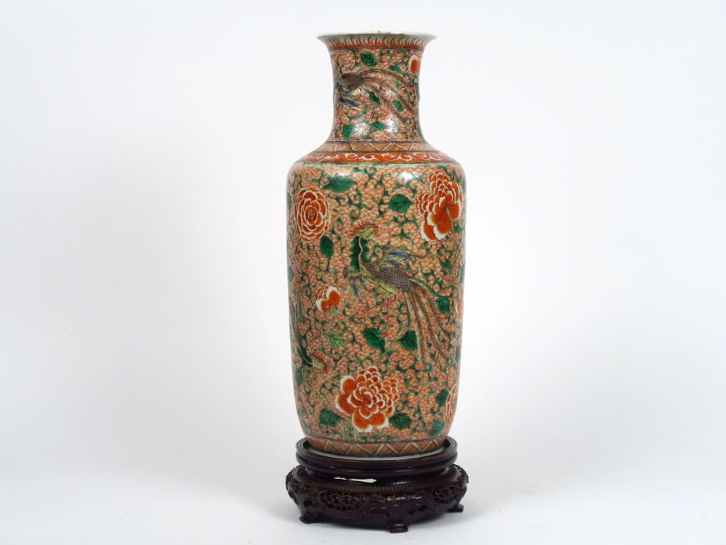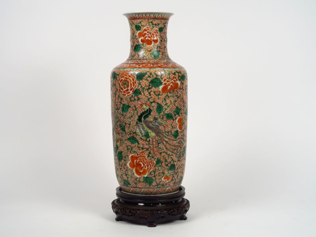 Vase rouleau en porcelaine, émaux famille verte à décor d'oiseaux forang évoluant parmi des arbustes en fleurs reposant sur des branches de pin stylisées. Chine, XVIIIème, période Qing. H. 44 cm (rétraction d'émail sur la base)