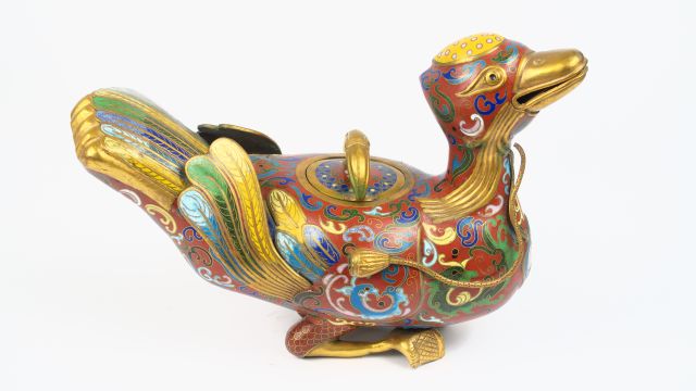 Verseuse en cuivre et émaux cloisonnés prenant la forme d'un canard, décorée en polychromie de dragons stylisés et de plumage. Chine, vers 1950.