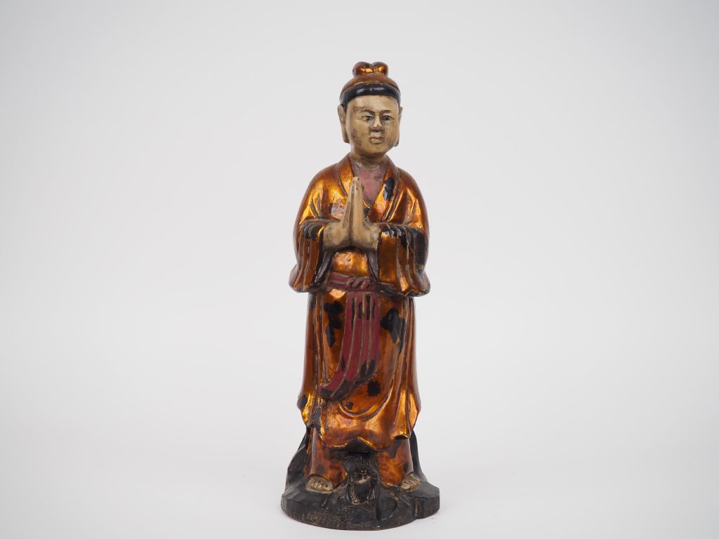 Vietnam, dynastie des Nguyen, fin XIXe siècle Statuette en bois anciennement laqué et doré, représentant un jeune bonze en prière. Usures. H. 39 cm