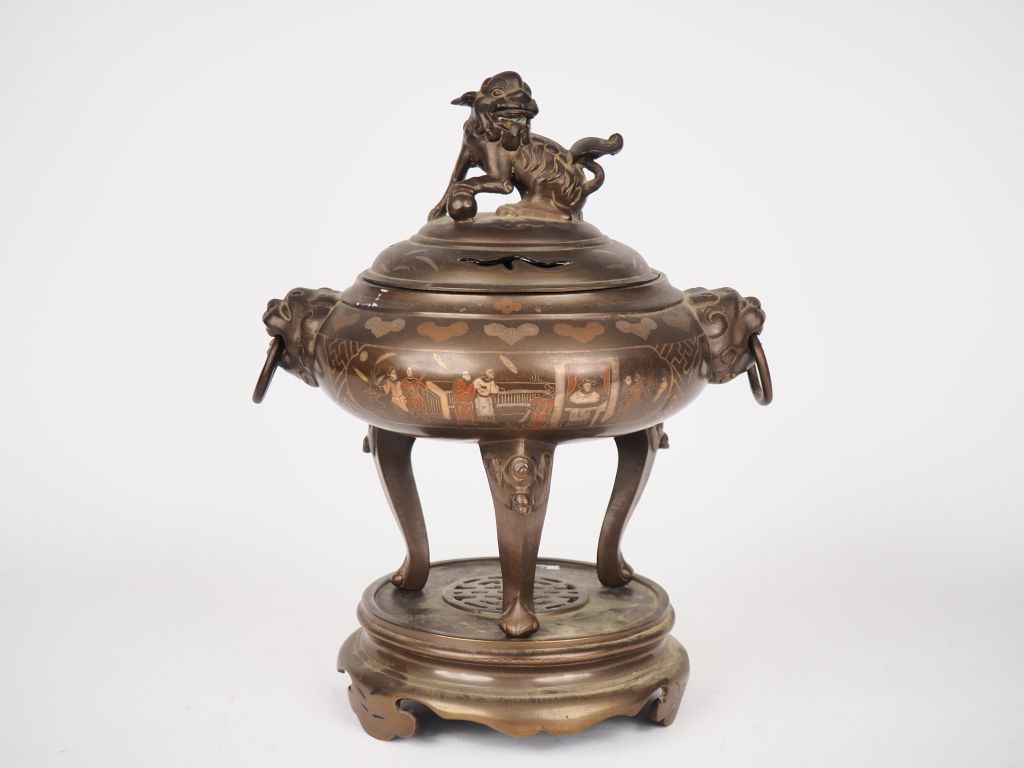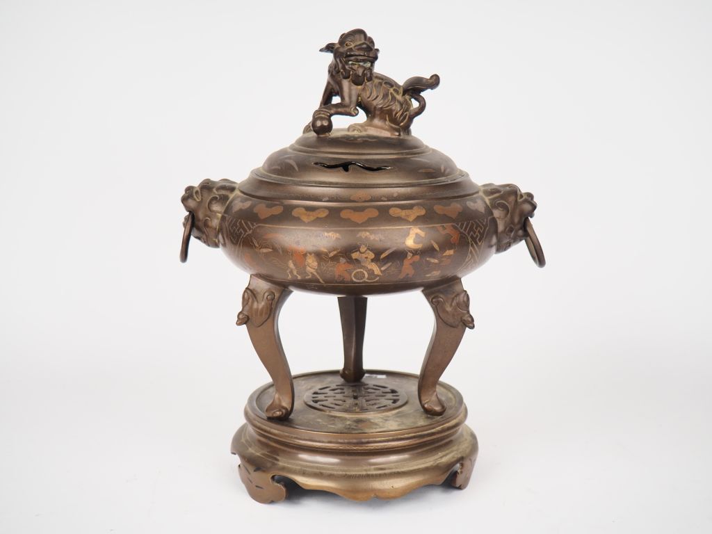 Vietnam, fin XIXe siècle, Brûle parfum tripode en bronze à décor niellé de personnages. Deux têtes de lions retenant des anneaux formant anses. La prise du couvercle surmontée d'un chien de fô. Sur son socle en bronze ajouré. H. totale 34 cm