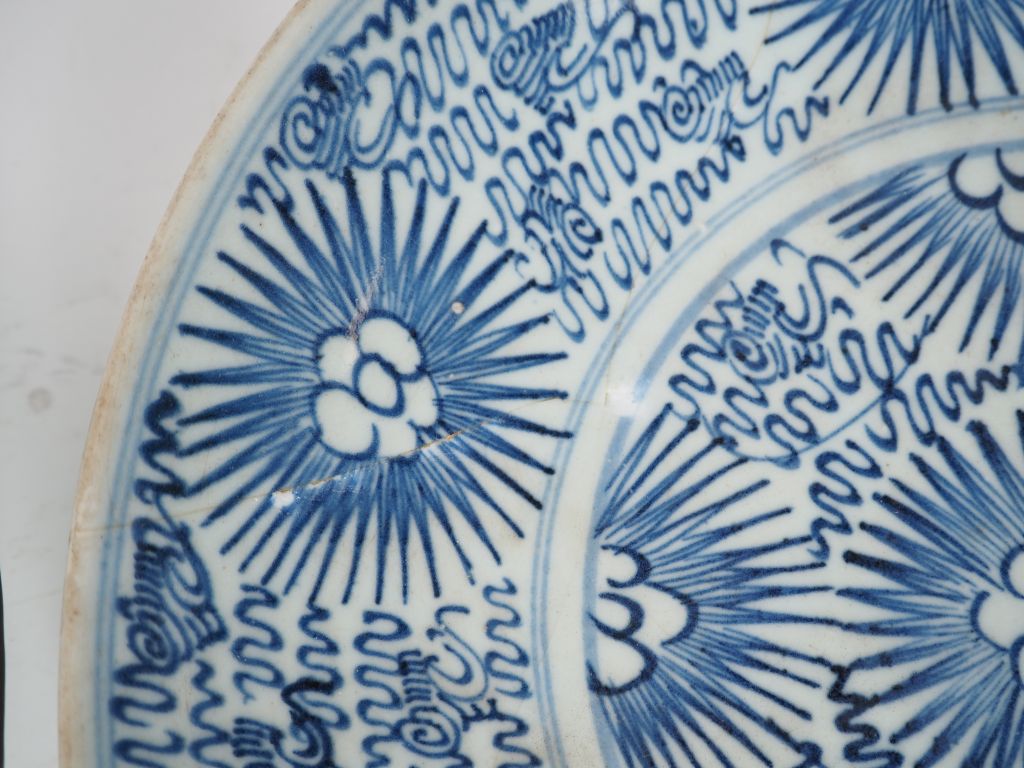 Vietnam, fin XIXe siècle, Deux assiettes en porcelaine bleu blanc, à décor pour l’une du motif shou, symbole de longévité entouré de têtes de ruyi formant une étoile, l’autre ornée de motifs floraux stylisés. Accidents. Diam. 27 cm et Diam. 28 cm
