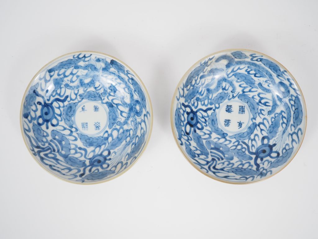 Vietnam, fin XIXe siècle, Deux coupes creuses en porcelaine blanche, à décor en bleu sous couverte, d’inscriptions à quatre caractères apocryphes « Yongle » en médaillon central, entouré d’un dragon évoluant parmi des flammes stylisées. Diam. 16 cm