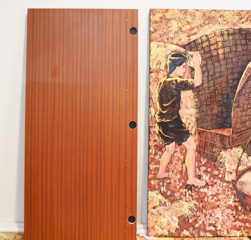 Vietnam, seconde moitié XXe siècle, Important panneau en laque polychrome et doré monté en paravent à quatre feuilles représentant des jeunes femmes et enfant dans les champs. Signature en bas à droite illisible. Dim. 140 x 200 cm