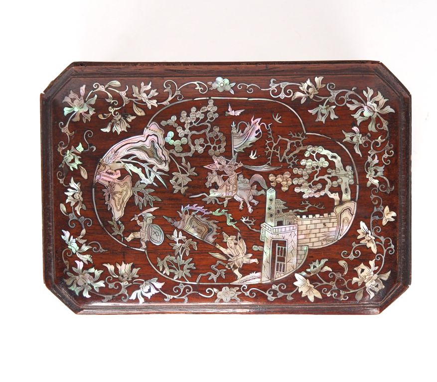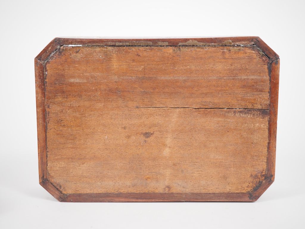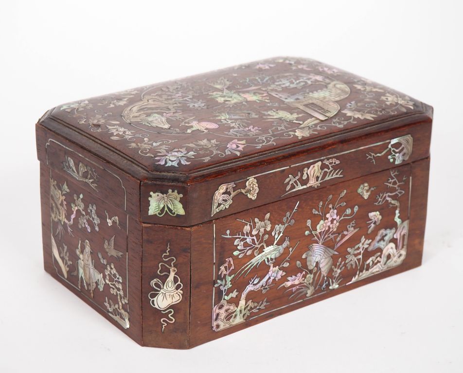 Vietnam, travail de Nandinh, vers 1920 Petit coffret rectangulaire couvert en bois, à décor marqueté de nacre de scènes guerrières, oiseaux, fleurs et végétaux. Dim. 10,5 x 21,5 x 14,5 cm (Petites gerces et petits points de colle)