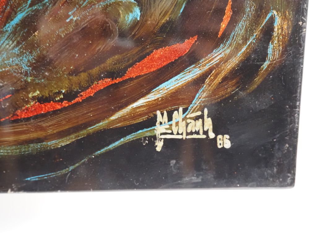 Vietnam, travail moderne, Deux panneaux en laque, représentant un guerrier blessé et retour des paysans accompagnés de leurs buffles. Signés Chanh Lê. 86. Dim. 91 x 60 cm Dim. 60 x 120 cm