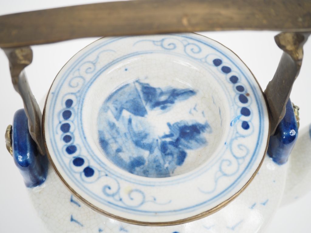 Vietnam, travail moderne, Theière en porcelaine bleu blanc, sur fond craquelé beige à décor d'une cité fortifiée entourée de pics montagneux. H. 17 cm