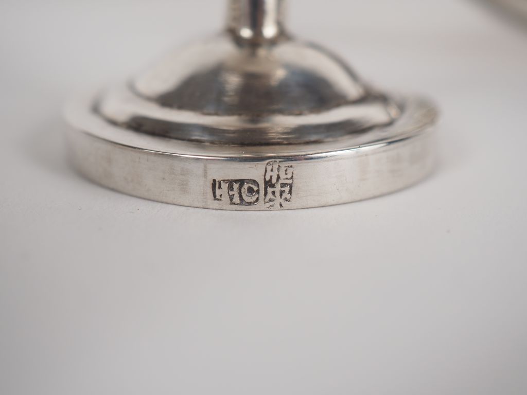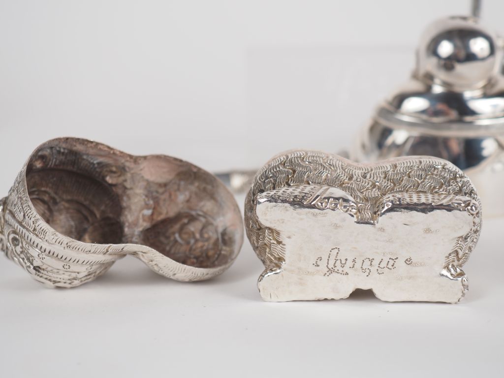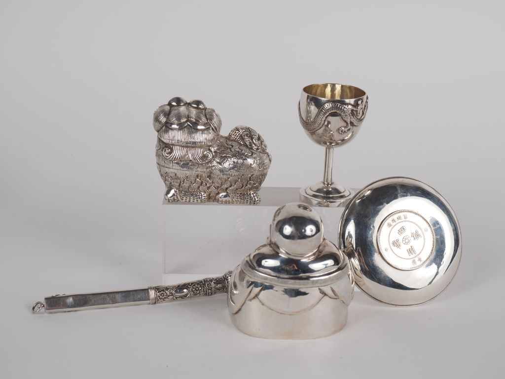 Vietnam, vers 1900 Ensemble de cinq éléments en argent comprenant, un petit sorbet, un bouddha milefo, un lion bouddhique, une petite coupe avec une monnaie, et un petit étui. H. 6,5 à 8 cm Poids. 270,39 g (enfoncements et accident sur l'étui)