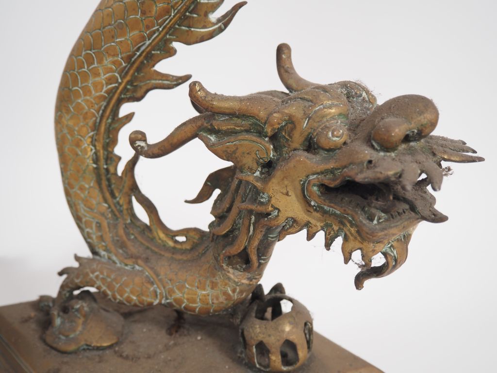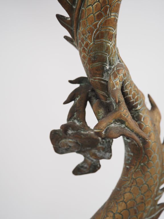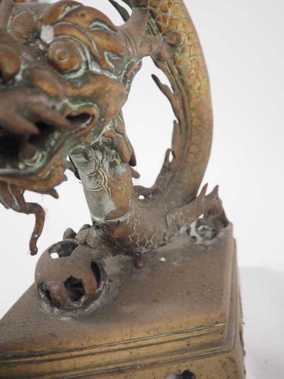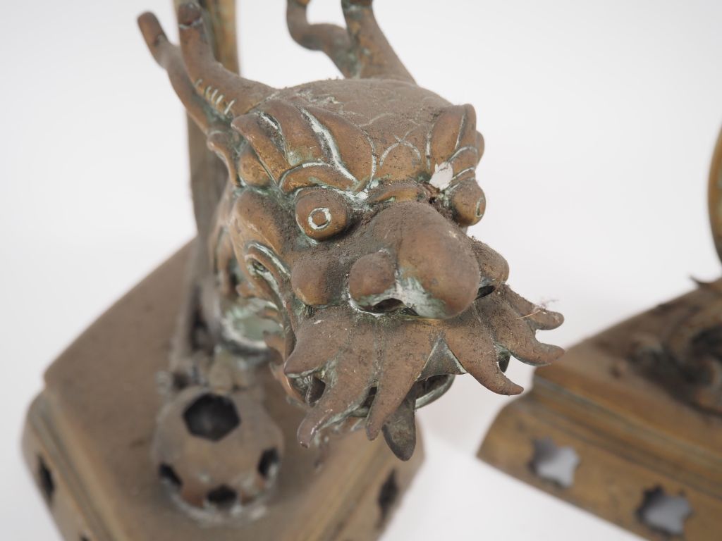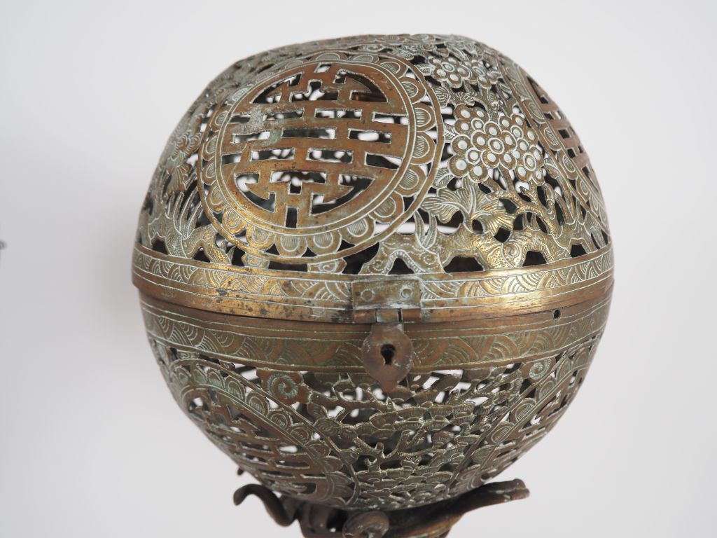 Vietnam, vers 1920 Paire de grands candélabres en cuivre de forme sphérique, reposant sur un piètement en forme de dragons, à décor des caractères shou, fleurs et prunus ajourés. H. 96 cm