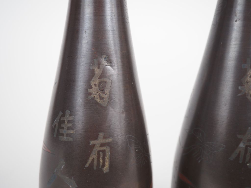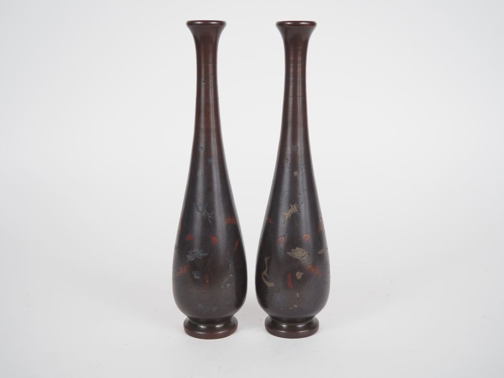 Vietnam, vers 1920, Paire de vases soliflores en bronze, à décor niellé d’argent et rouge, de fleurs de lotus et échassier. H. 29 cm (enfoncement)