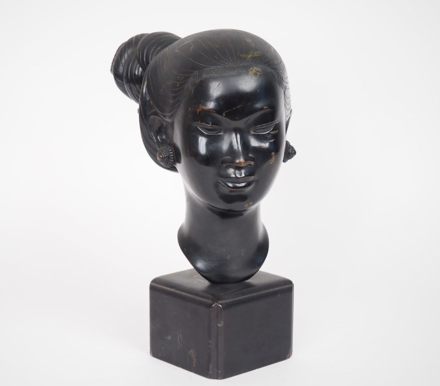 Vietnam, vers 1950, Tête de jeune femme annamite en bronze à patine brune, le visage coiffé d'un chignon. Marque d'atelier au revers. H, 24 cm (petites rayures)