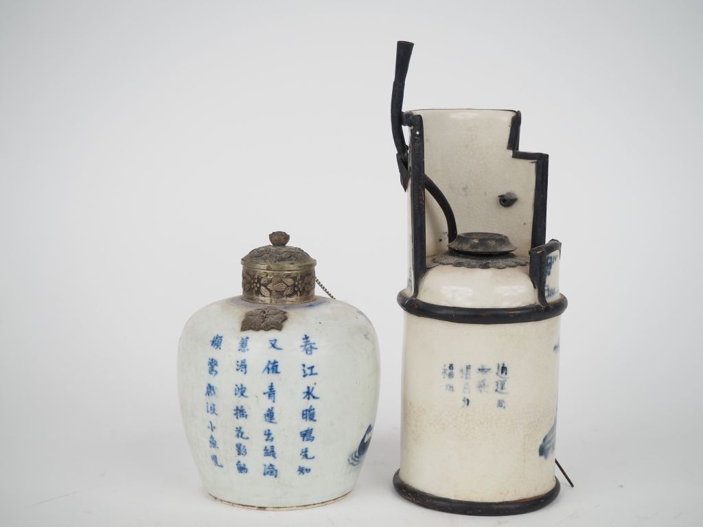 Vietnam, XIXe et XXe siècle, Pot couvert en porcelaine blanche à décor en bleu sous couverte de fleurs de lotus. Un poème d’après Su Shi de la dynastie Song complète l’ornementation. On y joint une pipe à eau en céramique émaillée bleu blanc ornée de fleurs et pins de longévité. Marque au revers sur le pot couvert Nha ngoan lu'u hu'o'ng. H. 13 cm H. 23 cm