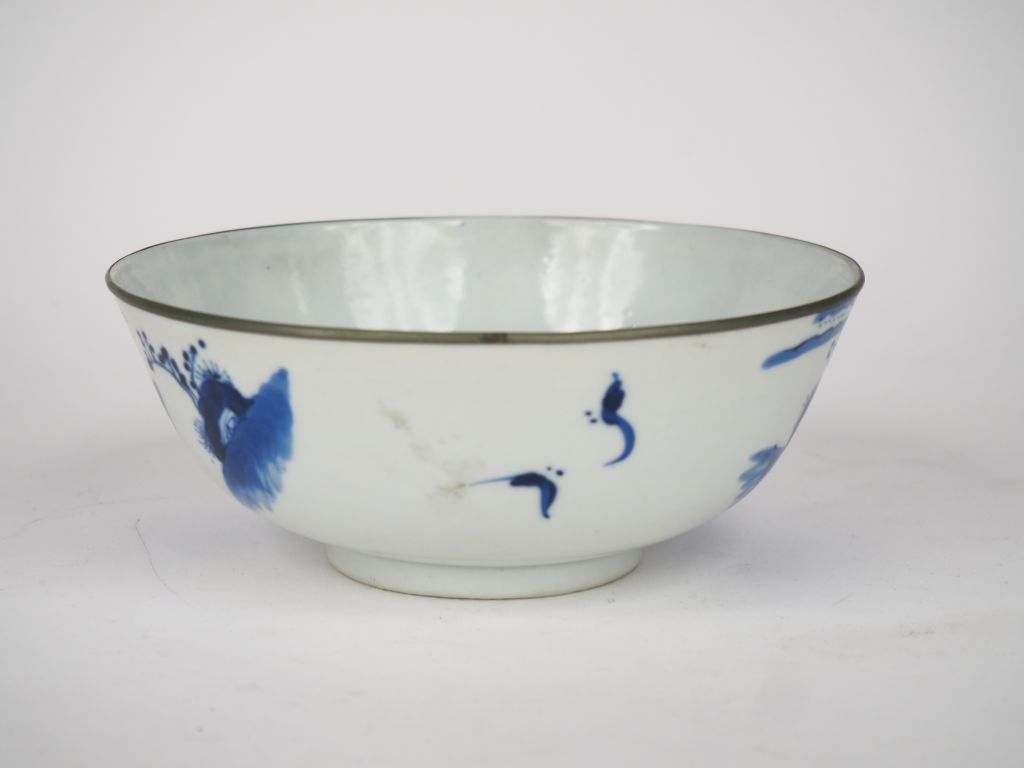 Vietnam, XIXe siècle, Coupe en porcelaine bleu blanc à décor de daims sous des pins de longévité. Marque à quatre caractères sous la base "Dào ngoc che thu" jade ceramic made for selling. Cerclée de métal. D.16 cm Un cheveu