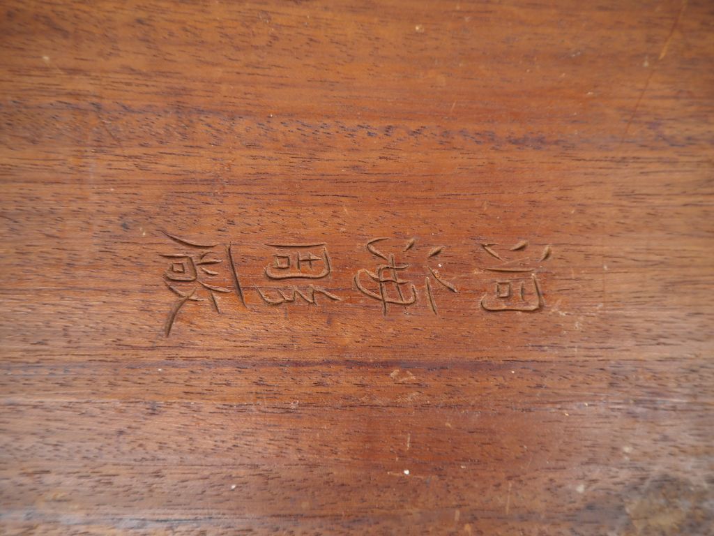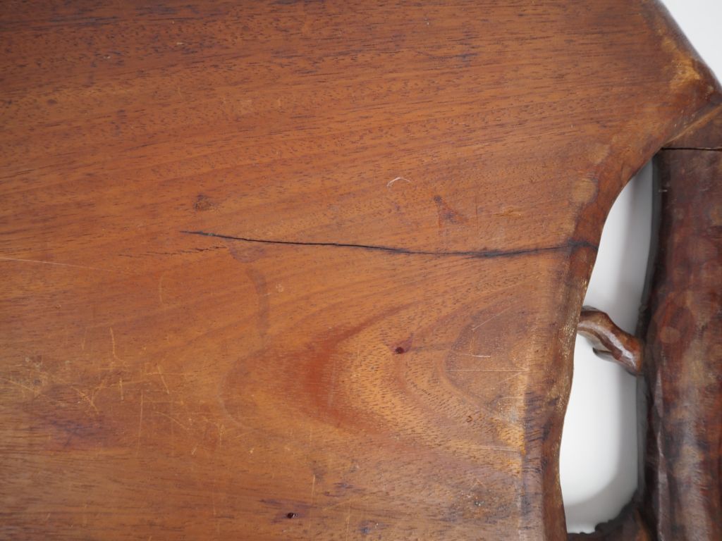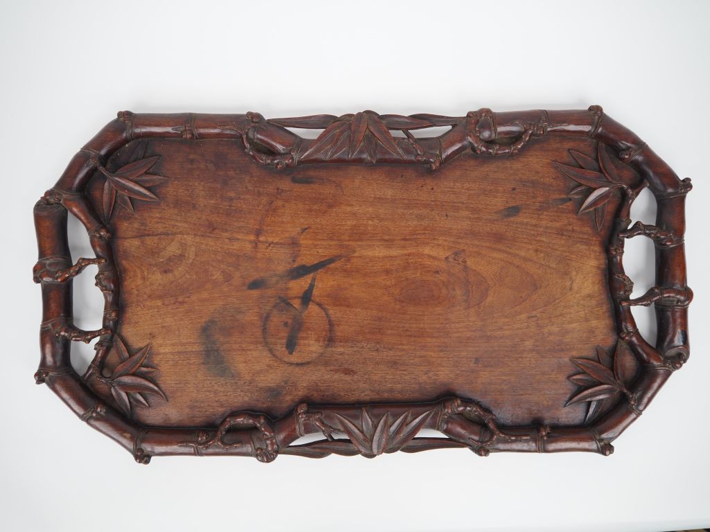Vietnam, XXe siècle, Important plateau à thé en bois , le pourtour et les anses reprenant la forme de branches de bambous. Calligraphies incisées au revers du nom de l'atelier. Taches sur le plateau. Dim. 67,5 x 37 cm