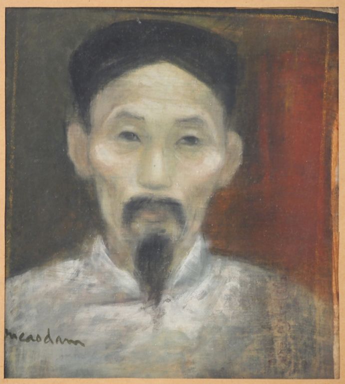 VU CAO DAM (1908-2000) Encre et couleurs sur soie « Portrait d’homme » Signée en bas à gauche. Dim. 21,8 x 19,5 cm Le portrait occupe une place importante dans l’œuvre de Vu Cao Đàm. Bien que ses œuvres soient majoritairement consacrées aux femmes et aux enfants, les figures masculines, plus rares, se distinguent par leur sobriété. Les traits de ses portraits masculins sont rendus avec une grande finesse, privilégiant des détails minimalistes permettant la mise en valeur de l'expression et l’âme du sujet. Le sujet est représenté avec un visage émacié, tandis que ses sourcils marqués accentuent la profondeur de son regard. Bien que l'nspiration des portraits d'ancêtres issus de la tradition chinoise soit perceptible dans la posture hiératique de l’homme, la finalité et le format de ce portrait diffèrent. Celui-ci s'inscrit davantage dans les codes occidentaux, adoptant une composition rigide et encadrée, plutôt qu'une présentation en rouleau. Aussi, le portrait s'affranchit de tout contexte cultuel pour devenir un hommage aux hommes d'estime. Les contrastes entre le blanc éclatant du vêtement et le rouge intense de l'arrière-plan confèrent à l'œuvre une dimension à la fois solennelle et officielle. Parmi ses œuvres notables, Vu Cao Đàm a réalisé le portrait de Hô Chi Minh lors de sa visite à Paris en 1946 pour la conférence de Fontainebleau. Il a également immortalisé des figures telles que son père, Vũ Đình Thi, ainsi que des lettrés, renforçant ainsi l’universalité et la sensibilité de son art. Expert : Cabinet Ansas - Papillon - de Léry.