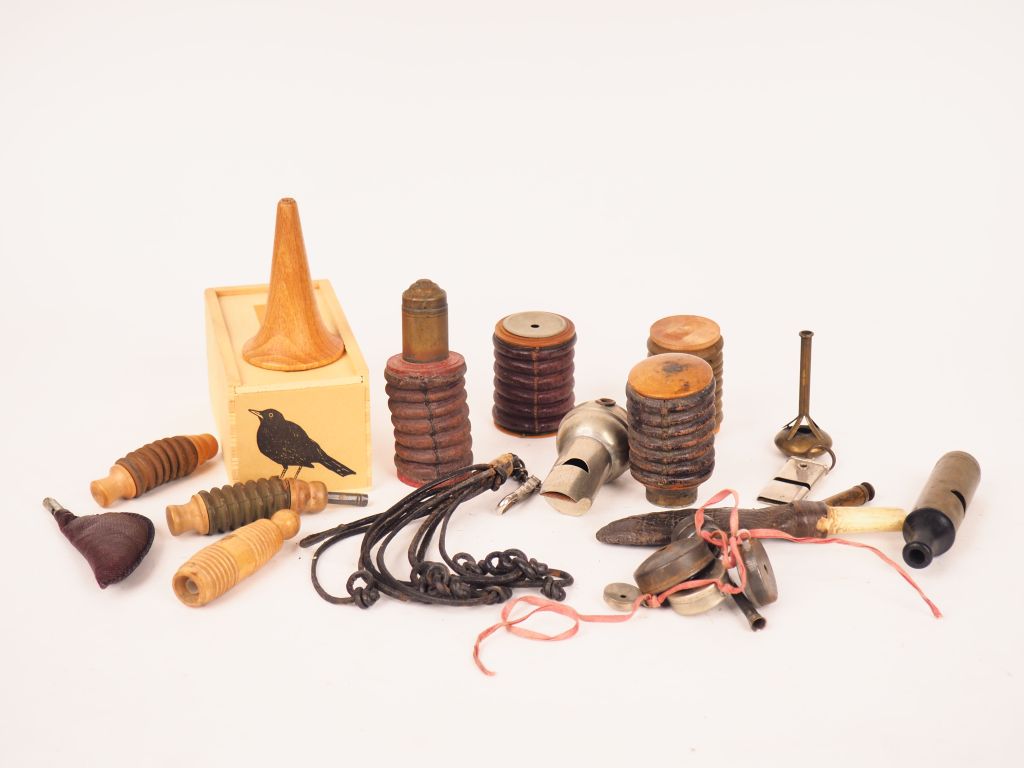Lot de Lot de 17 appeaux en bois et liège au prix de 20 à 30 € en vente aux enchères par l'hôtel des ventes Primardeco