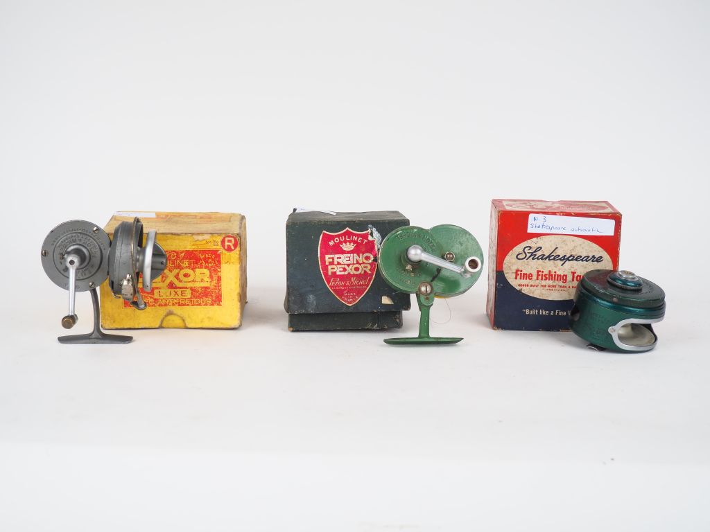 Lot de 3 moulinets dans leurs boîtes : - PEZON ET MICHEL. FREINO PEXOR - PEZON ET MICHEL. LUXOR - SHAKESPEARE Automatic