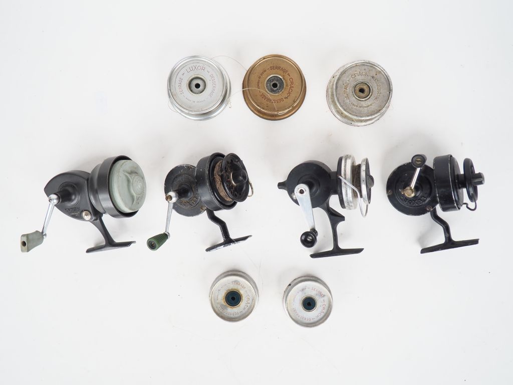 Lot de 4 moulinets de pêche dont LUXOR RELAX, PEZON ET MICHEL LUXOR, PEZON ET MICHEL SPORT et 5 bobines