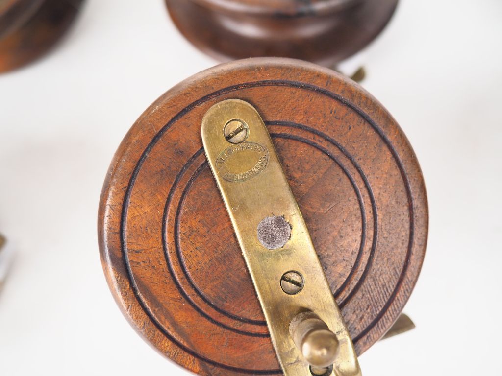 Lot de 6 moulinets de pêche en bois dont un signé ALLCOCK.