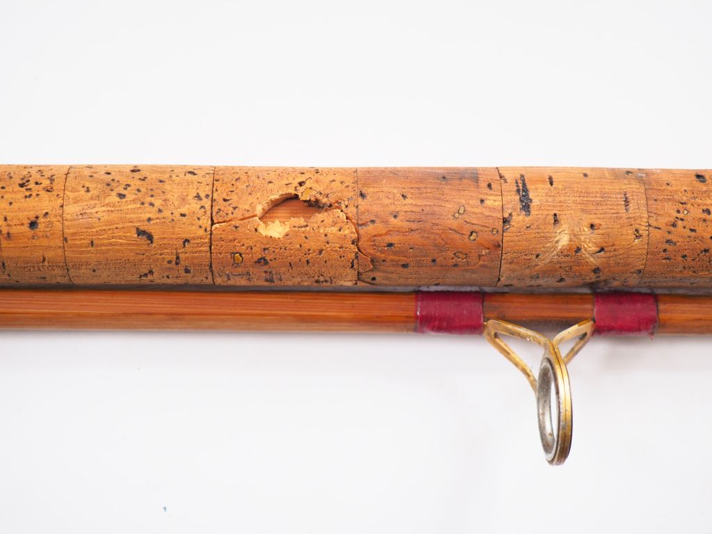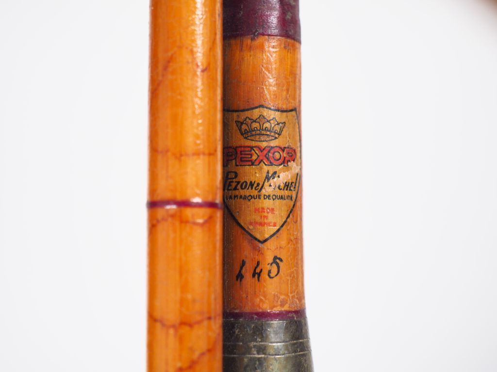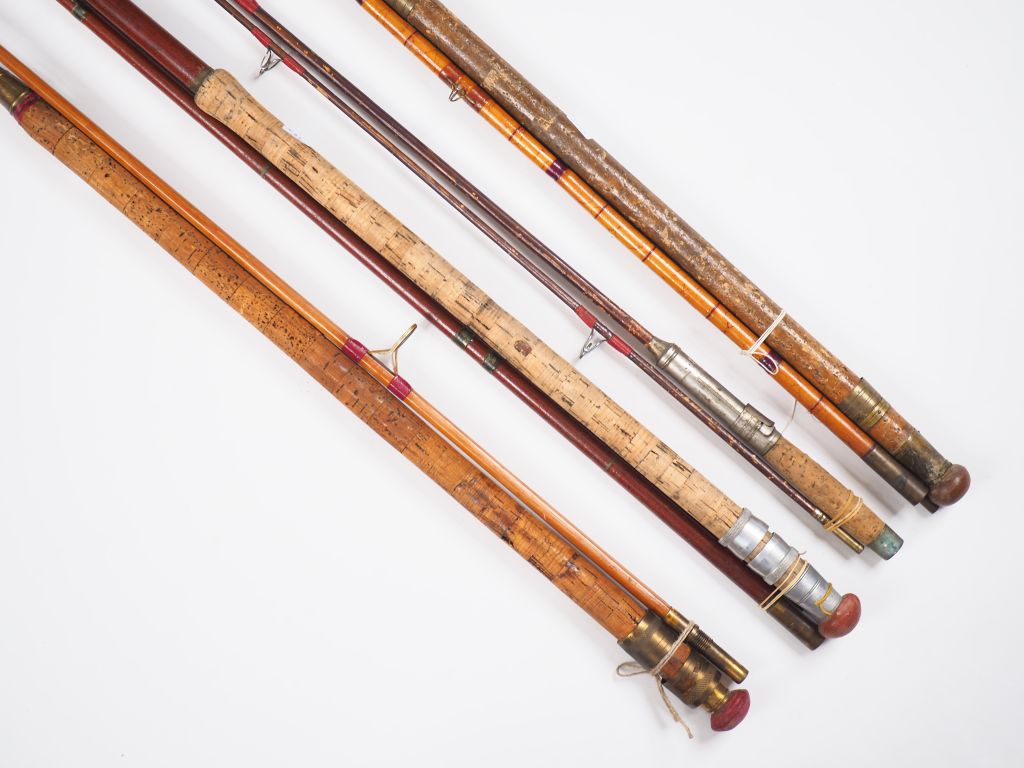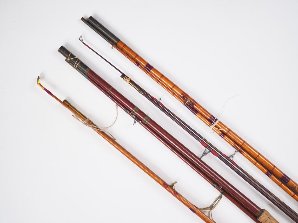 Lot de quatre cannes à pêche : - Canne au coup en roseau, scion bambou refendu - Canne à lancer en bambou refendu ( à revernir). - Canne au toc en conolon ( 3,70 m ). - Canne au lancer en bambou refendu (3,10m).