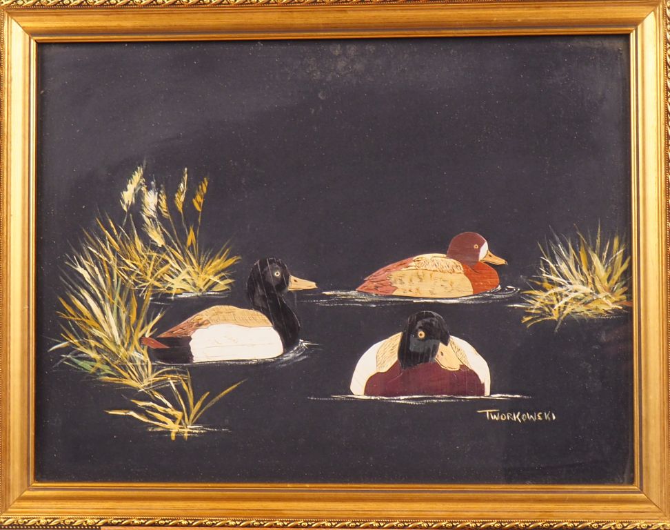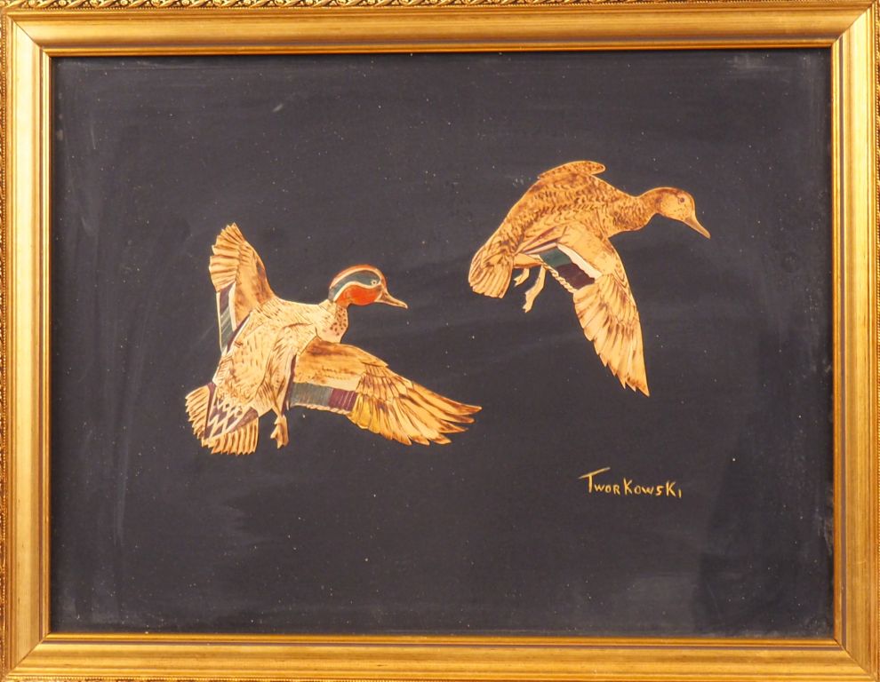 TWORKOWSKI. Lot de 2 tableaux figurant des canards on y joint un encadrement figurant une libellule