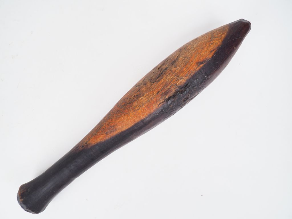 Battoir à tapa Kanak, Nouvelle Calédonie ( ?) Bois dur à patine brun noir à brun clair L. 36 cm Fuselé et marqué par une loupe claire dans le bois. Expert : Emmanuelle MENUET