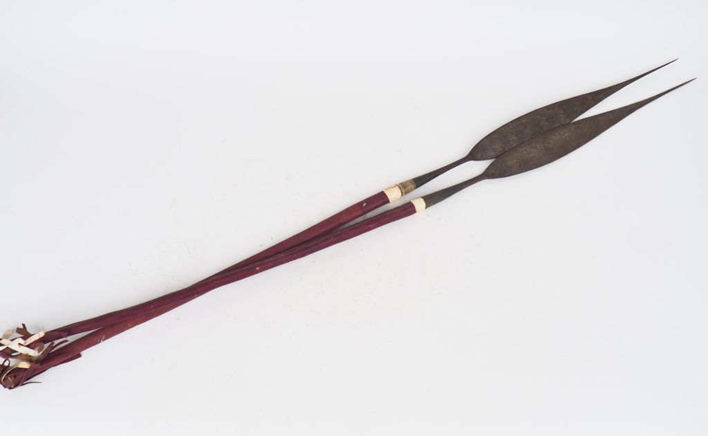 Lot de deux lances Touareg, Niger Fer, cuir rouge L. 127 cm Expert : Emmanuelle MENUET