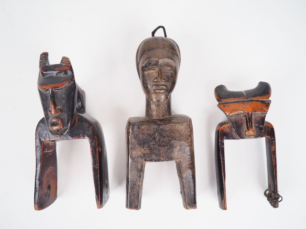 Lot de trois étriers de poulies, Côte d’Ivoire A. Baoule Bois à patine brune, fer H. 16,5 cm Sculpté au sommet de l’étrier angulaire de deux têtes janus. Anneau de suspension en fer. B. Ligbi, Djimini Bois à patine miel à brun foncé noir, accident et manque, restauration indigène H. 11 cm Orné d’un visage surmonté de cornes de buffles. Belle patine brillante et marques d’usage ancien. C. Ligbi, Djimini Bois à patine brun foncé noir, accident et manque H. 13,5 cm Surmonté d’une tête aux détails en moyen relief ornée de cornes. Expert : Emmanuelle MENUET