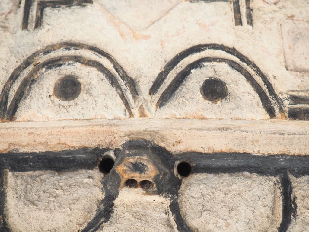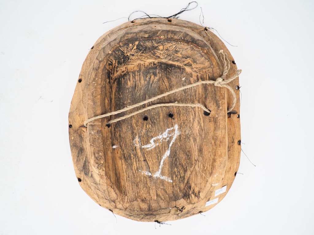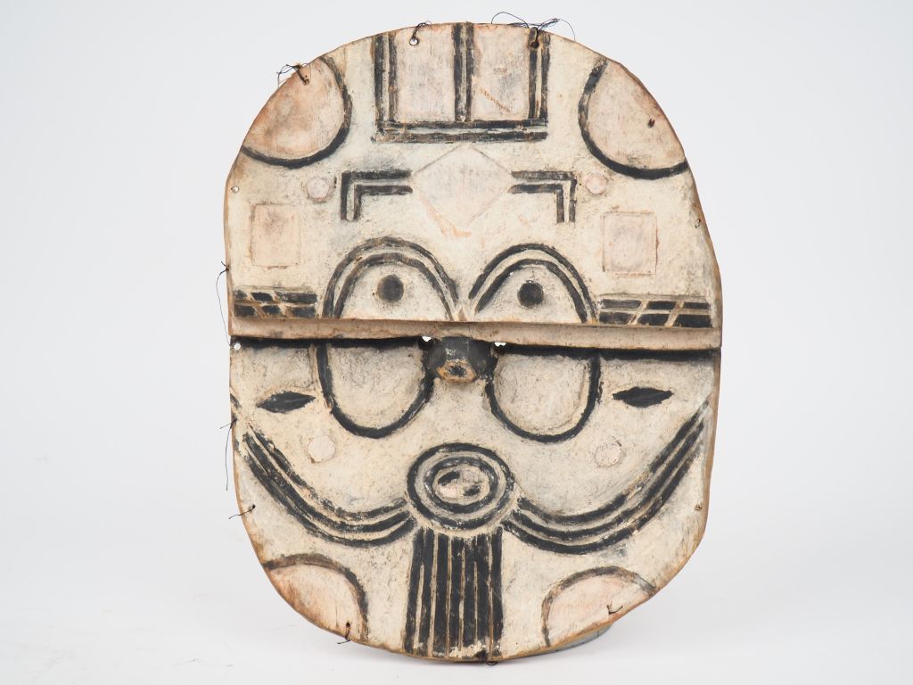 Masque kidumu Teke Tsaayi, République Démocratique du Congo Bois à patine brune, pigments noirs et blancs H. 31 cm Petit masque kidumu parcouru de motifs rehaussés de pigments noirs sur fond blanchâtre, une ligne de fracture le divisant horizontalement. Sous le regard factice peint en noir, deux percements. Au revers, un bourrelet sculpté dans la masse permettait le maintien du masque. Expert : Emmanuelle MENUET
