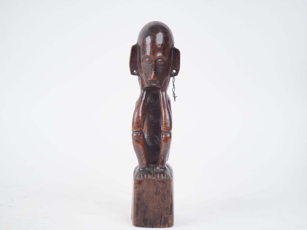 Statuette Îles Taminbar (?), Indonésie Bois à patine brune, métal, vernis H. 25 cm Effigie en position assise, les coudes ramenés aux genoux dans une position traditionnelle, les mains au visage. Une petite boucle a perduré à l’oreille gauche. XXe. Probablement vernie. Expert : Emmanuelle MENUET
