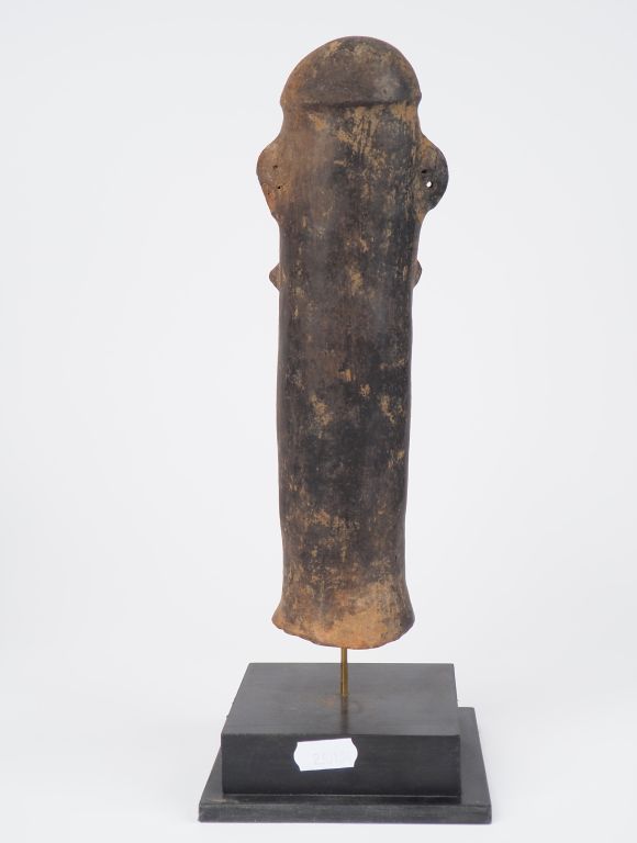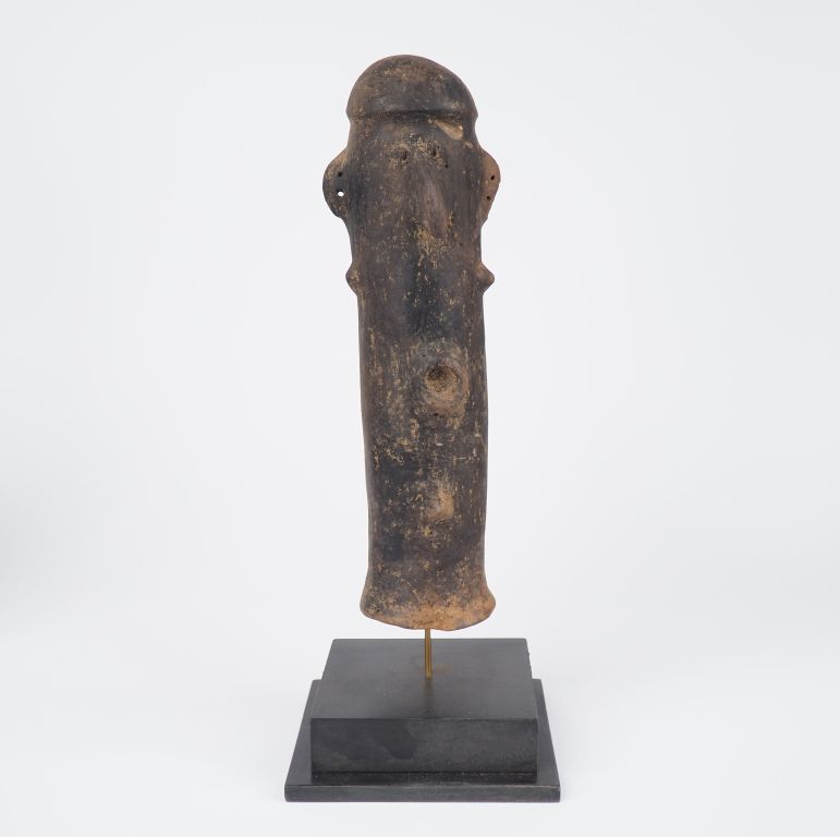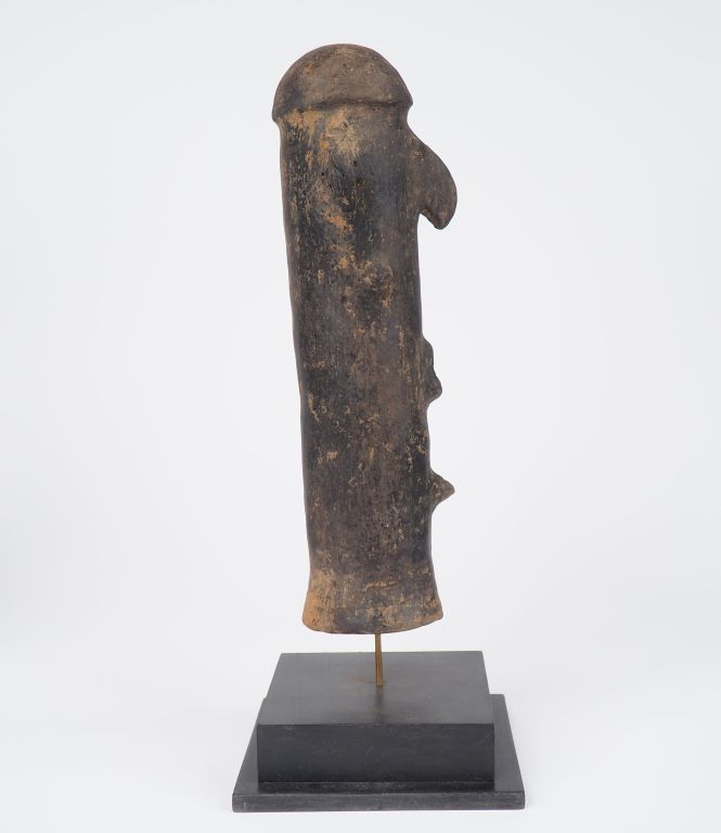 Tête Bura, Niger Terre-cuite à engobe noir H. 25 cm Tête funéraire ponctuée de détails en haut relief, la coiffe en calotte, le regard pastillé inscrit à la naissance du nez. Bel engobe noir profond. Expert : Emmanuelle MENUET