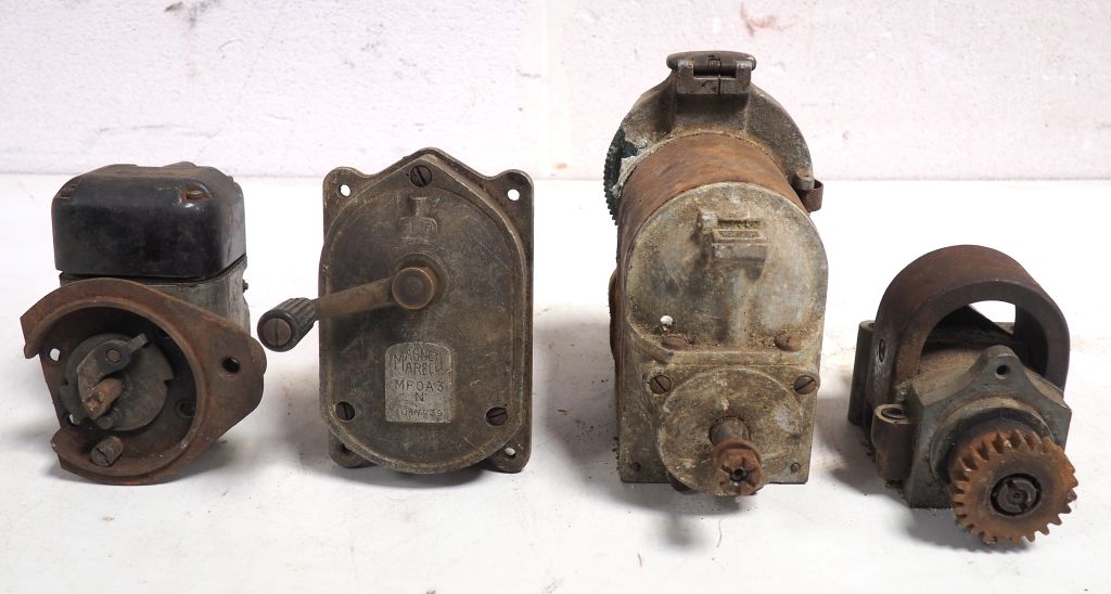 Lot de 4 différents magnétos pour automobile BOSH LAVA, BOSH, MAGNETI MARELLI au prix de 100 à 150 € en vente aux enchères par l'hôtel des ventes Primardeco