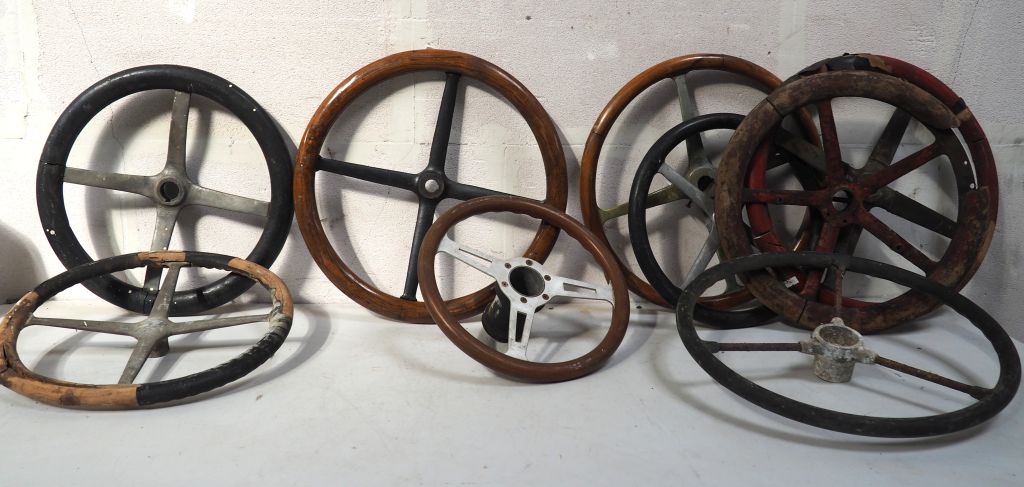 Lot de 9 différents volants pour automobile anciens. au prix de 80 à 120 € en vente aux enchères par l'hôtel des ventes Primardeco