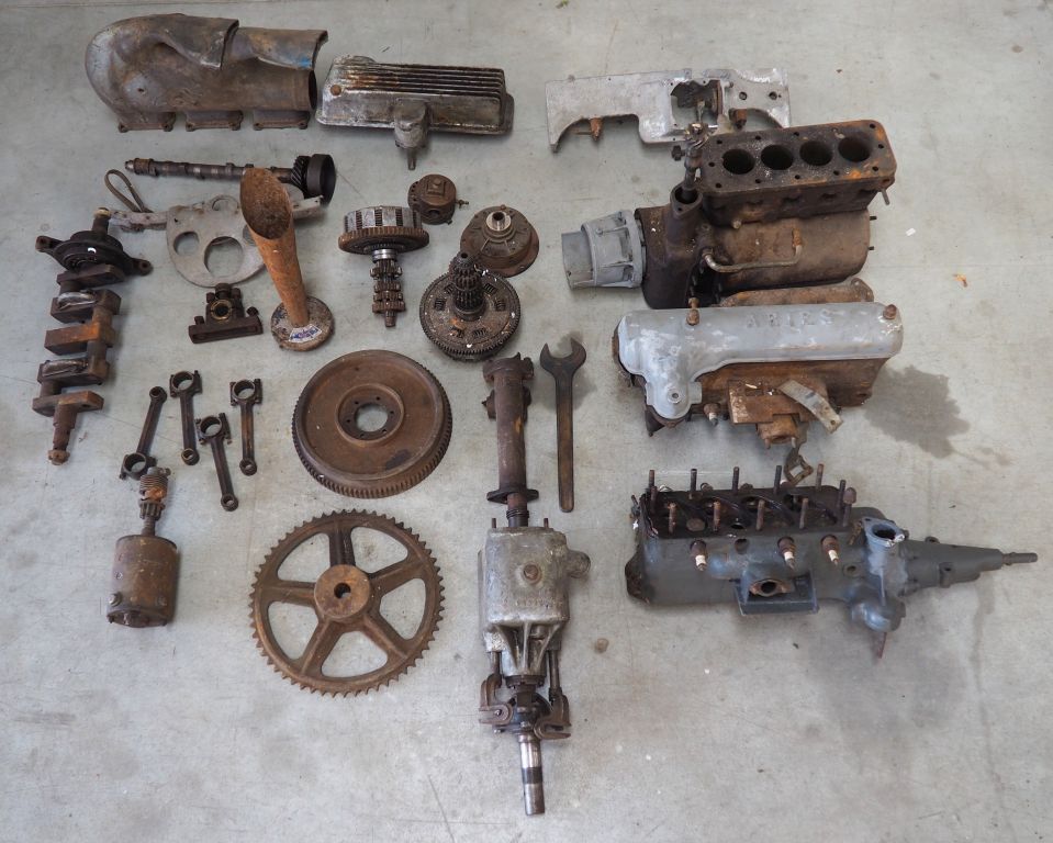 Base d'automobile ARIES avec différentes pièces dont moteur. (A restaurer). Vente sur désignation (Toulouse 31100) exposition sur RDV.