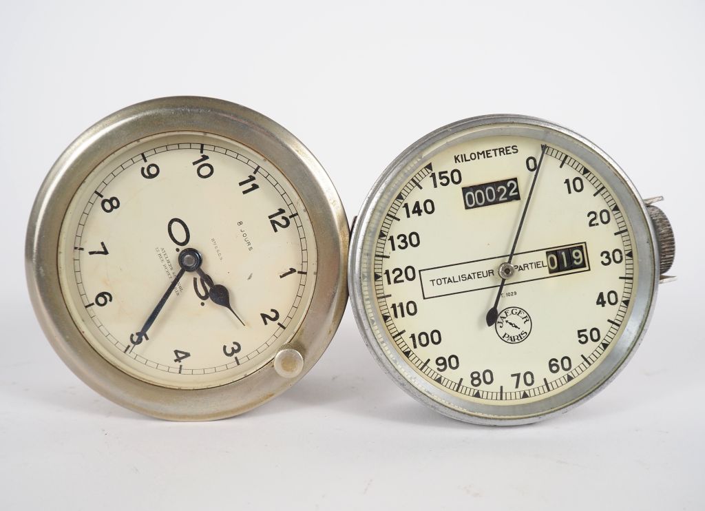 Compteur automobile JAEGER. Diam. 8 cm. On y joint un compteur automobile OS. Diam. 9 cm.