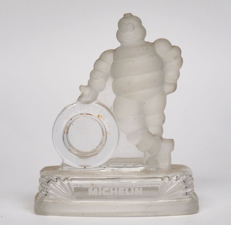 Lot de MICHELIN. Bibendum appuyé sur un pneu, sujet en verre. Dim. 18 x 15 x au prix de 15 à 20 € en vente aux enchères par l'hôtel des ventes Primardeco
