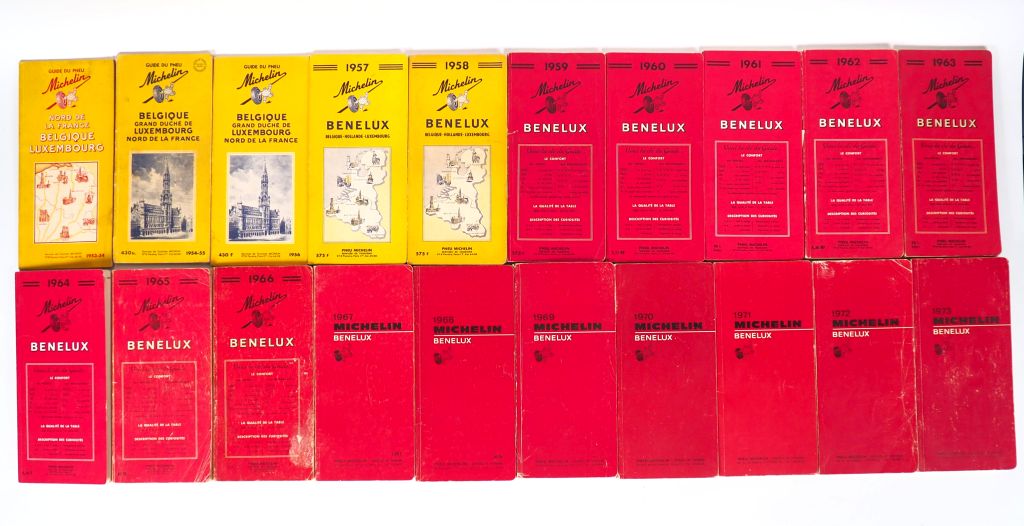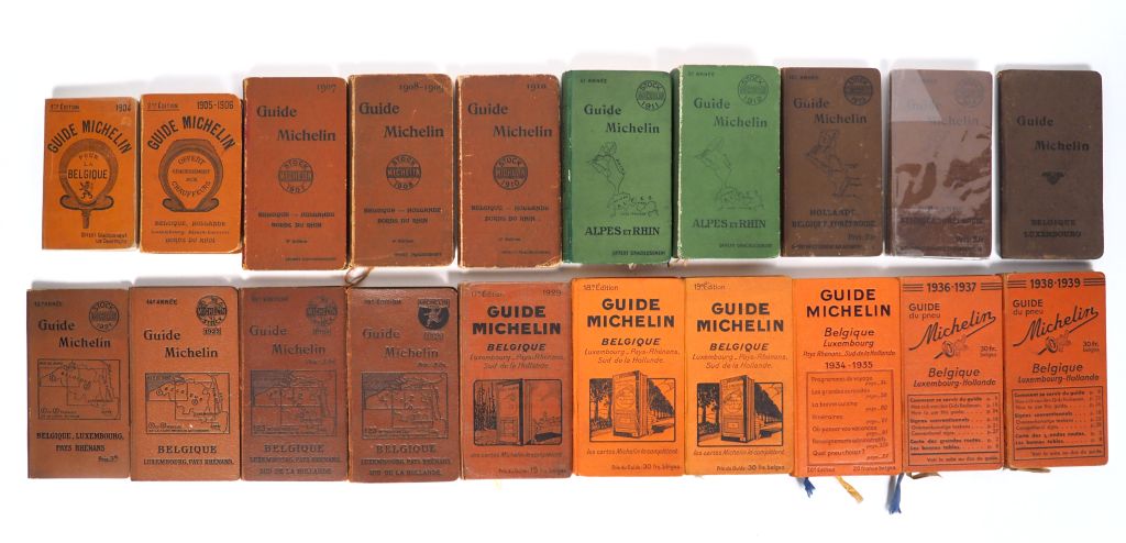 MICHELIN. Collection complète de guides Bénélux, édition française, de 1904 jusqu'à 2021 (90 guides). ( quatorze volumes en état d'usage et deux volumes avec traces d'écriture).