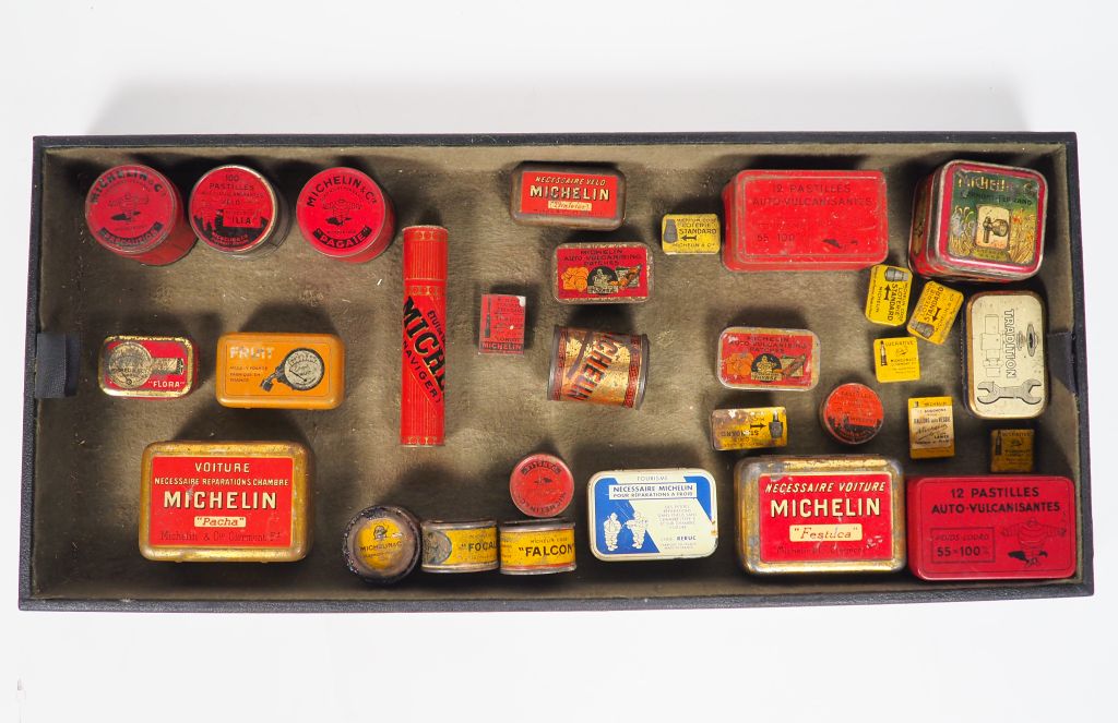 Lot de MICHELIN. Lot de 30 différentes boîtes publicitaires en tole lithograp au prix de 50 à 60 € en vente aux enchères par l'hôtel des ventes Primardeco
