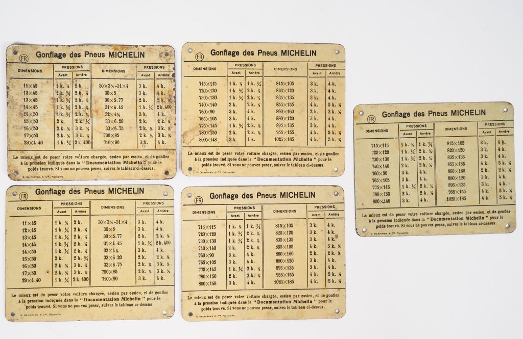 MICHELIN. Lot de 5 plaques "Gonflage des pneus MICHELIN" en tôle lithographiée.