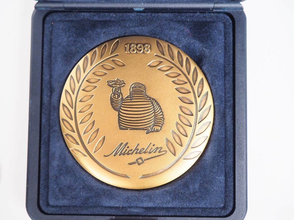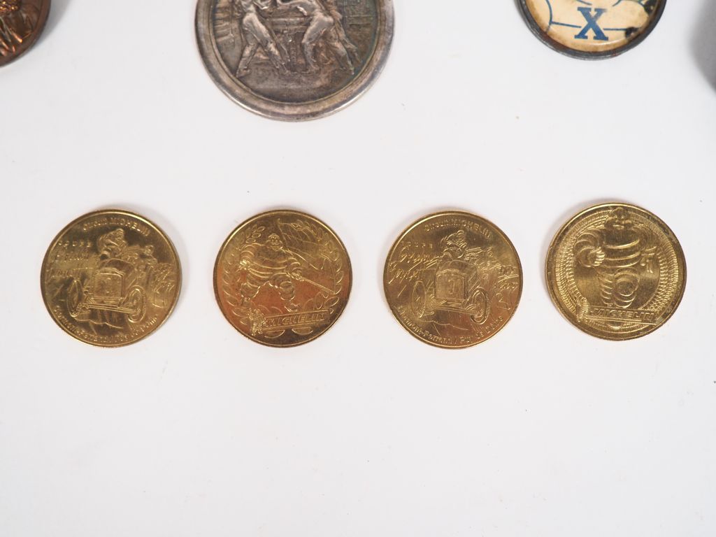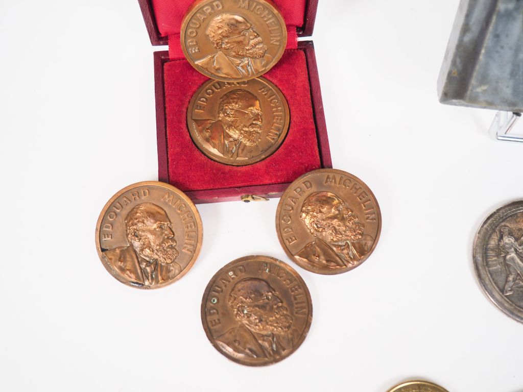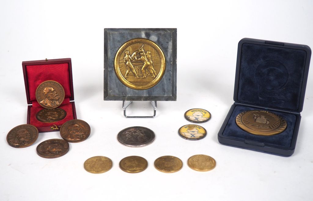 MICHELIN. Lot de médailles comprenant : - Cinq médailles du travail en bronze à l'effigie d'Edouard Michelin - Charles Philippe PILLET, deux médailles "le démoulage d'un pneu", dont une sur un socle en marbre - Une médaille centenaire de Bibendum 1898-1998 dans son écrin - Quatre médailles commémoratives "Monnaie de Paris" - Trois jetons Michelin