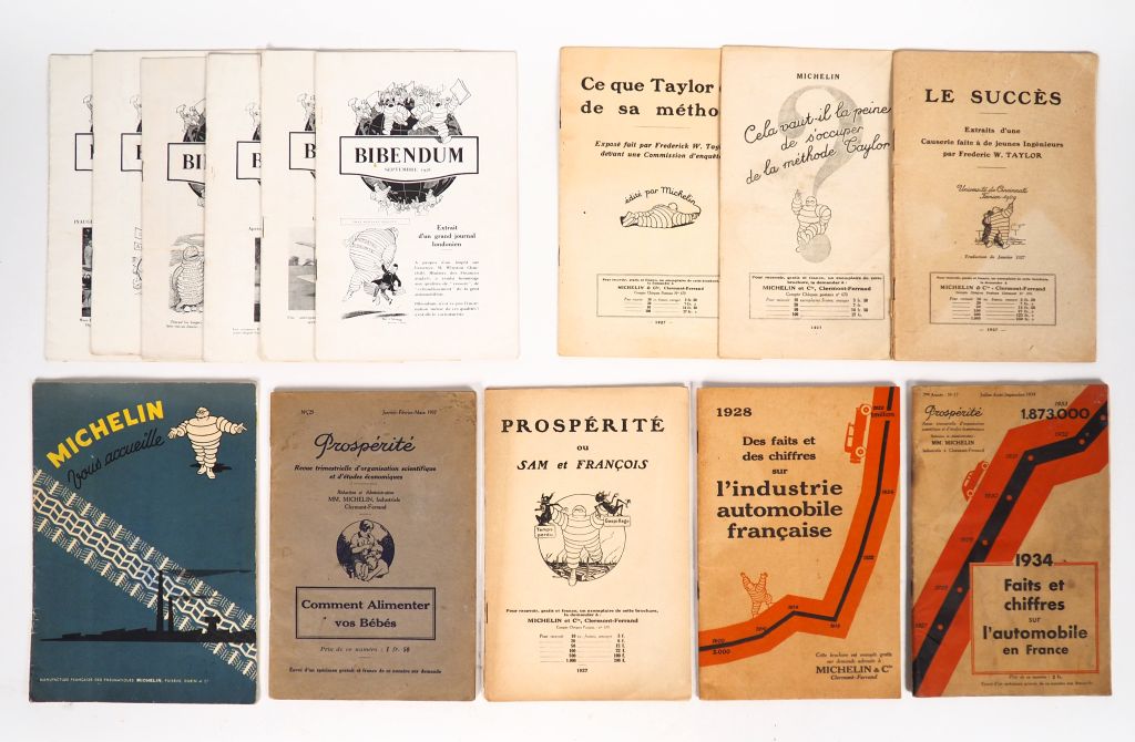 MICHELIN Lot de quinze livrets ou fascicules : - Six Bibendum ( sept 1928, février - avril- juin- juillet- août 1929) - Deux livrets "Des faits et des chiffres sur l'industrie automobile française par Michelin Cie" ( 1928 et 1934). - Trois livrets Prospérité, deux de 1927 et un de 1937. - Trois différents livrets sur la métthode Taylor (1927) - "Michelin vous accueille" ( 4ème édition - 1958)