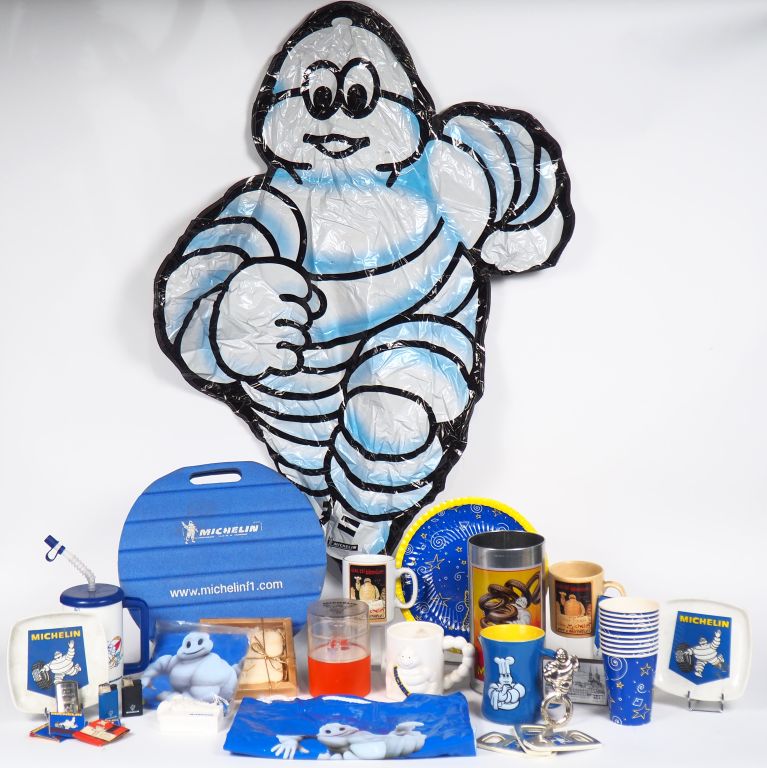 MICHELIN. Lot d'objets publicitaires comprenant des mugs, gobelets et assiettes en carton, deux maniques, deux cendriers, briquets, pochettes d'allumettes et décapsuleurs.