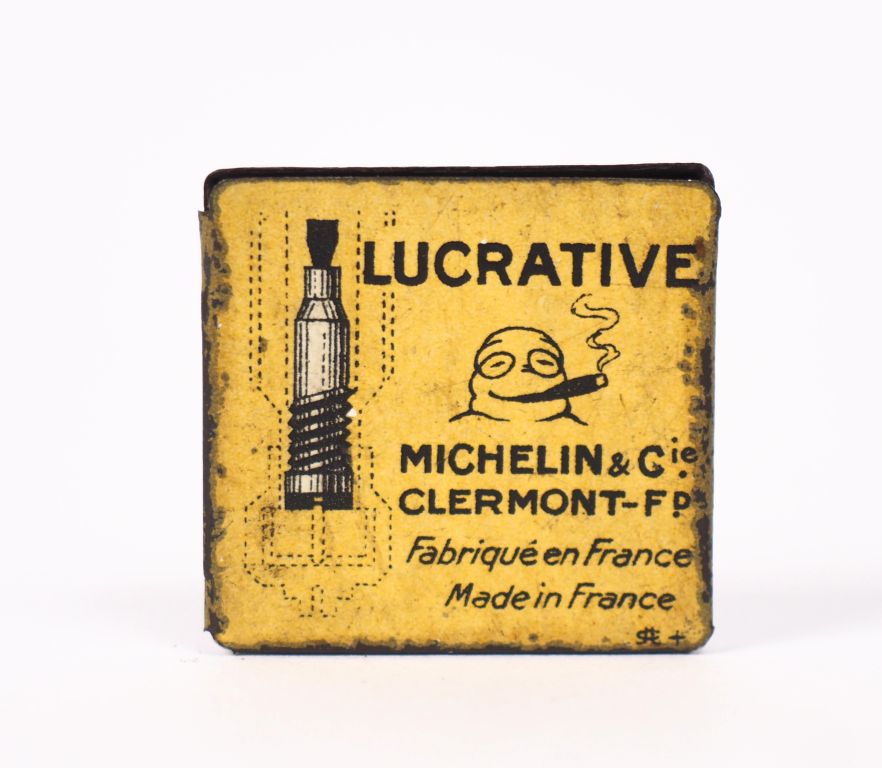 Lot de MICHELIN. Petite boîte en tôle lithographiée jaune, valve lucrative ci au prix de 30 à 50 € en vente aux enchères par l'hôtel des ventes Primardeco