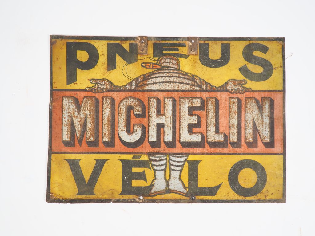 MICHELIN. "Pneus vélo". Plaque en tôle lithographiée. Dim. 47,5 x 68 cm. (rouille et accidents)