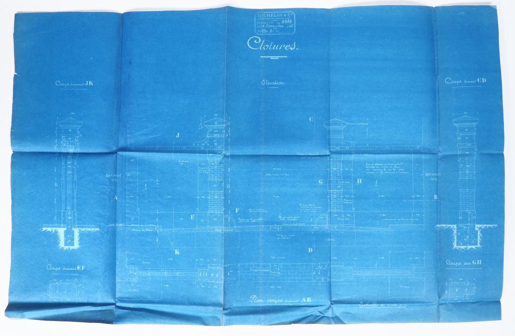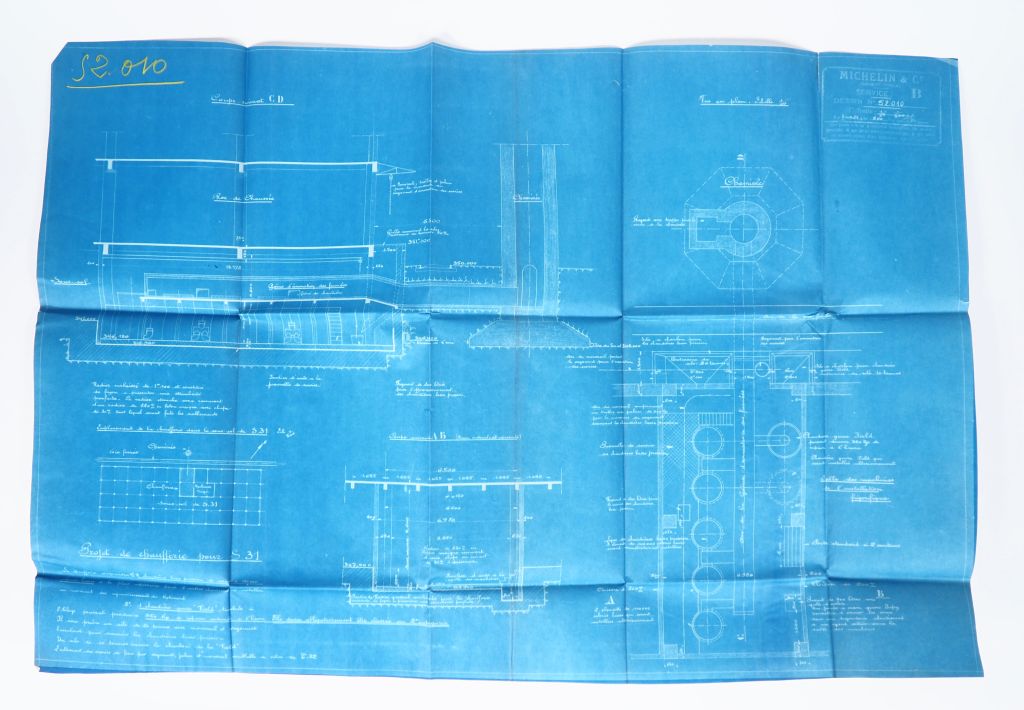 MICHELIN. Quatre différents plans : - deux plans de clôture datés du 10 et 23 novembre 1906 - Projet de chaufferie pour S.31daté du 7 octobre 1924 - Un réservoir de 100 m3 daté du 17 mars 1920 (état d'usage).