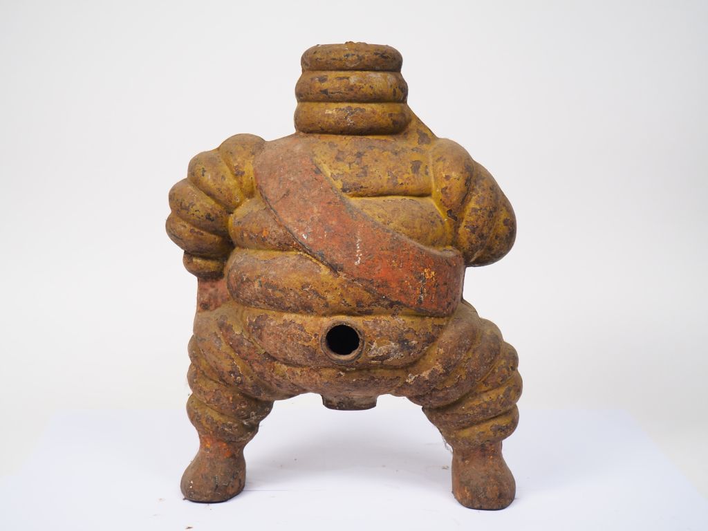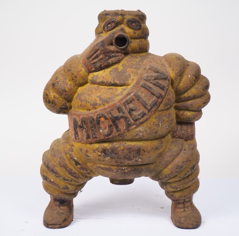 MICHELIN. Sujet bibendum en fonte surmontant à l'origine un compresseur. Dim. 36 x 27 x 17 cm. (état d'usage)