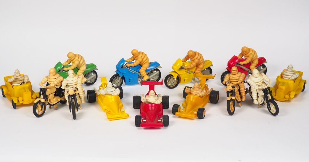 MICHELIN. Sujets Bibendum en plastique sur motos de course, motos, tacots et monoplace. (accidents).