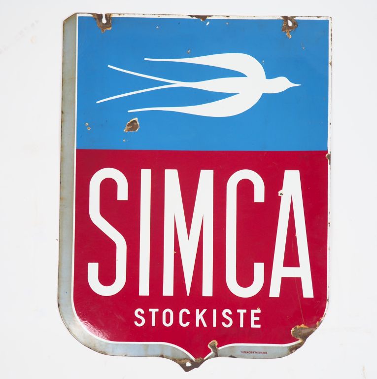 SIMCA STOCKISTE. Plaque émaillée. Dim. 86 x 65 cm. (accidents)