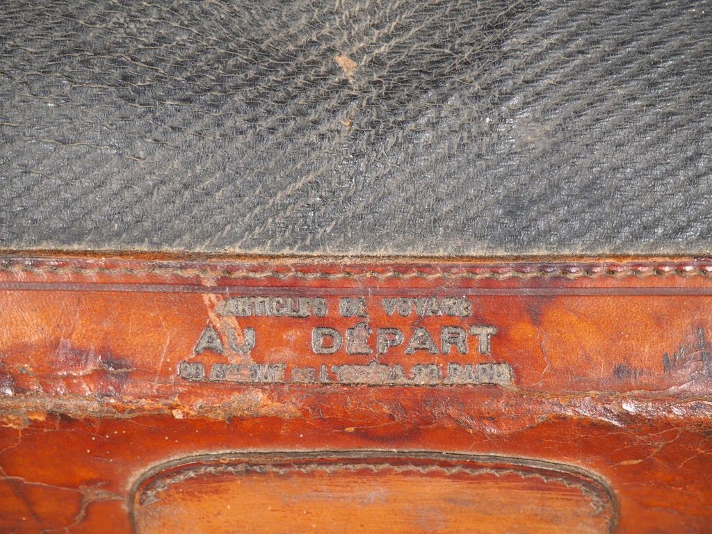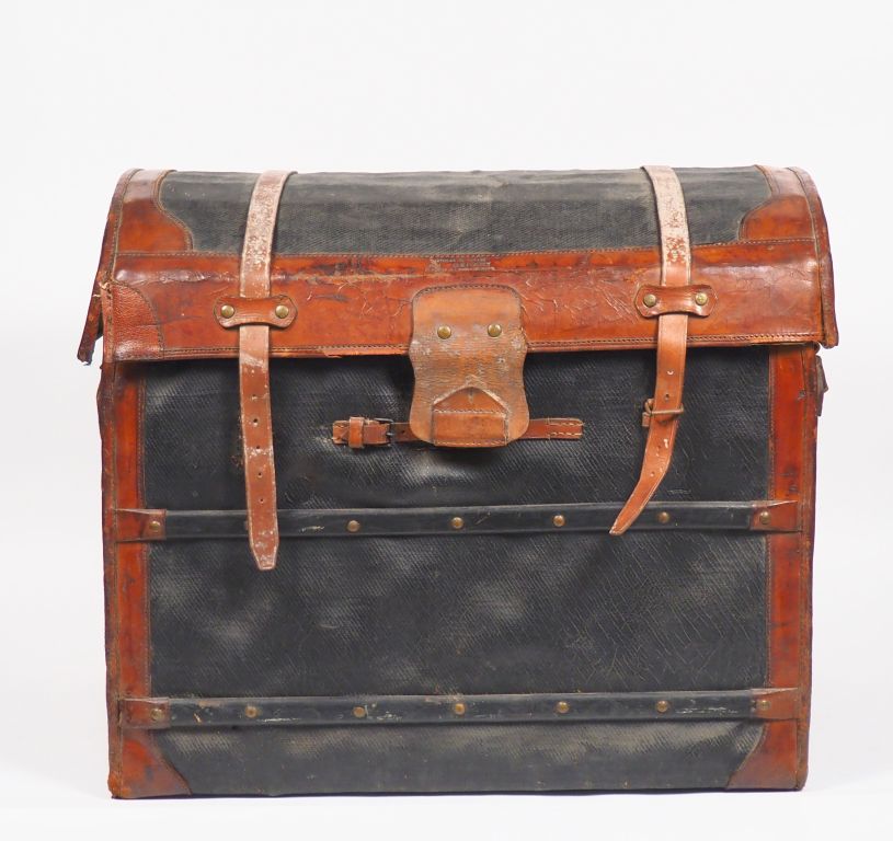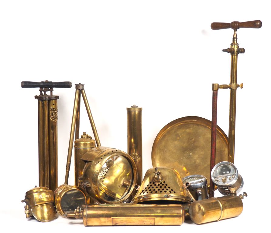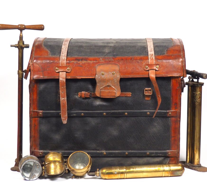 Une malle en osier 'articles de voyage "Au Départ" ' comprenant un lot de phares, éléments de phares en laiton, deux différentes pompes à pied et cinq réservoirs en laiton. Dim. (malle) : 65 x 76,5 x 52 cm.
